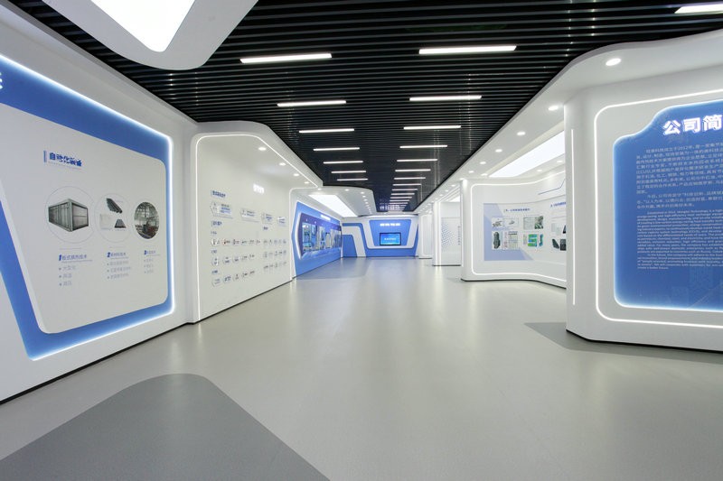 顶和地面造型统一,白色吊顶和灰色橡胶地面,黑色方钢吊顶和灰色橡胶地面相互呼应,统一中富有变化,变化中又蕴含统一,使整个展厅科技意境深远悠长。